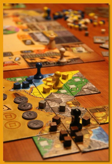 We had a 3-player game in the 2nd heat - myself, Kit, and another fellow who's name I've forgotten (I have GOT to write this stuff down!). I had a pretty good game...too good, as it turns out. I was able to do most of what I wanted, and I was able to get the bonus token that gives you points for resources. I used that score 17 points at the end of the game, and blew away my two opponents by over 10 points. And then Michelle Hymowitz, the GM, came over and explained that that bonus token was used only for goods in your barn...not ALL your goods. Oh...uh...yeah...sorry about that. My opponents were gracious, and insisted I keep the win, since we had all been playing thinking it scored the way we had originally scored it. But we did a theoretical "what-if", and how would I have played it differently, and it turns out that Kit would have been real close to my score, and had a good chance of winning. Since I was already in the final from my first victory, I happily conceded and asked that Michelle advance Kit to the final.Carcassonne